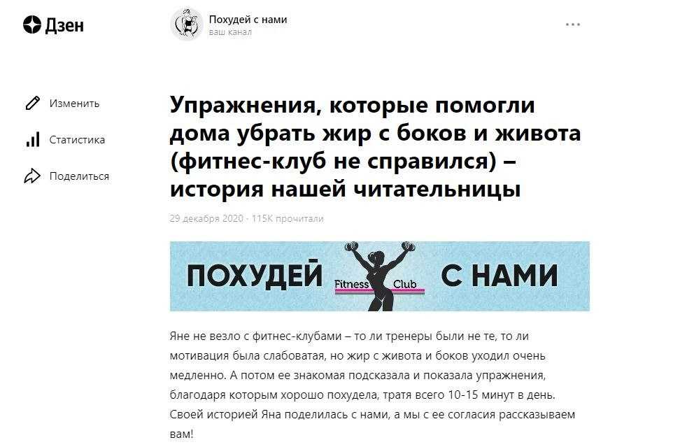 Приведу простой пример незамысловатой истории, написанной с целью продвижения оффера из ниши похудения, «Пока бока». Статья «Упражнения, которые помогли дома убрать жир с боков и живота (фитнес-клуб не справился) — история нашей читательницы» опубликована 29 декабря 2020 года. Буквально за месяц она набрала 115 000 дочитываний.