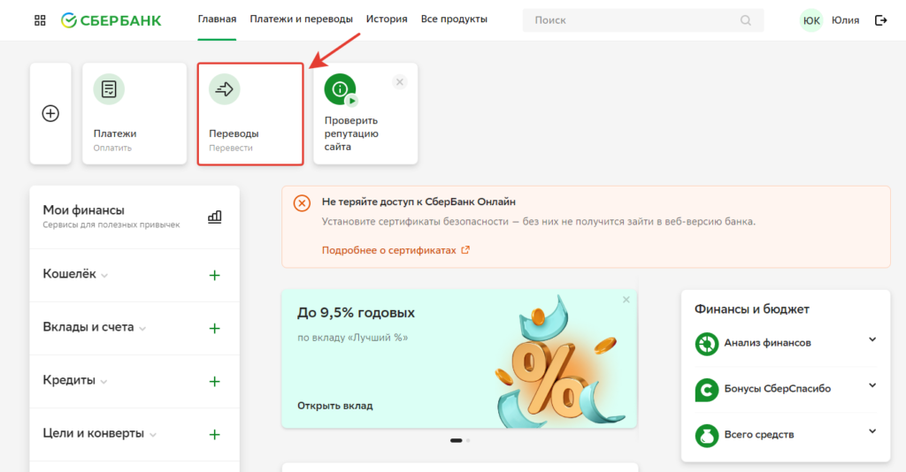 Чтобы отправить деньги через интернет-банк, зайдите в личный кабинет под своим паролем. На главной странице нажимаем кнопку «Переводы»: