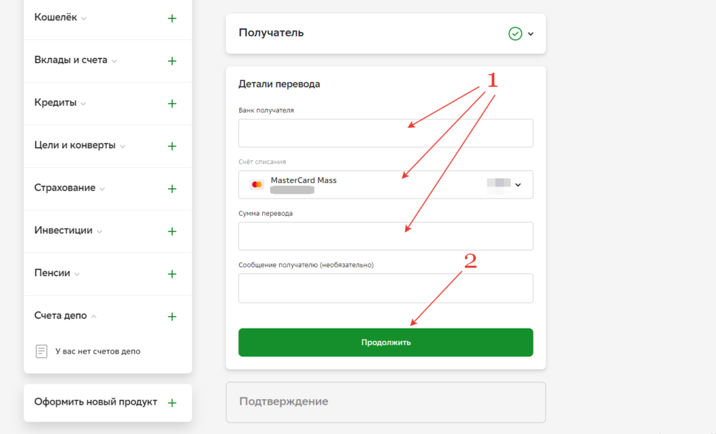 - Указать телефон получателя и нажать кнопку «Продолжить».