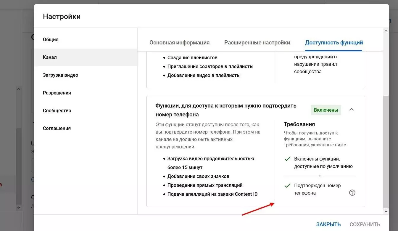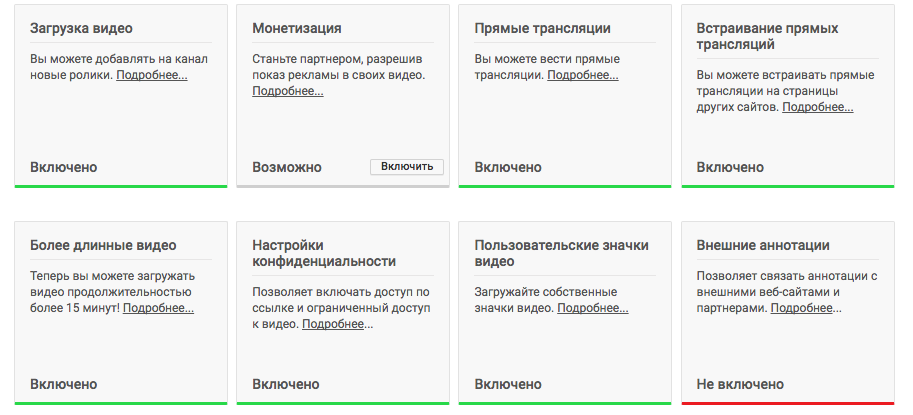 В разделе «Статус и функции» будет отображаться детальная информация по вашему каналу, а также те функции, которые сейчас доступны