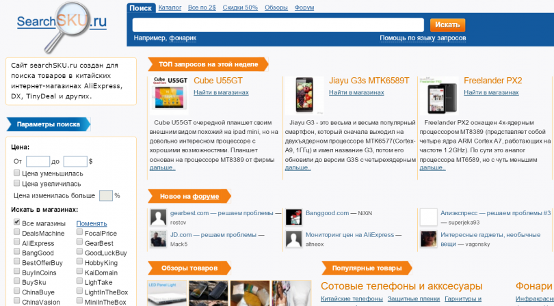 Помимо этого сайт имеет удобный поисковик по самым популярным магазинам – searchsku.ru, с помощью которого удобно искать определённую вещь сразу во всех популярных магазинах.