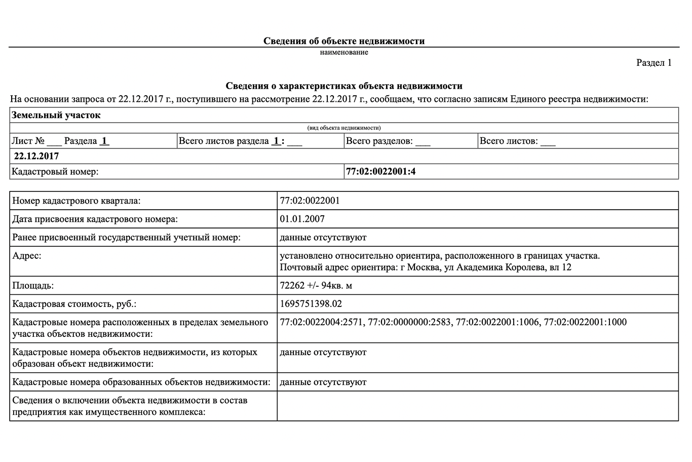 В этом документе указываются комплексные данные об объектах недвижимости: