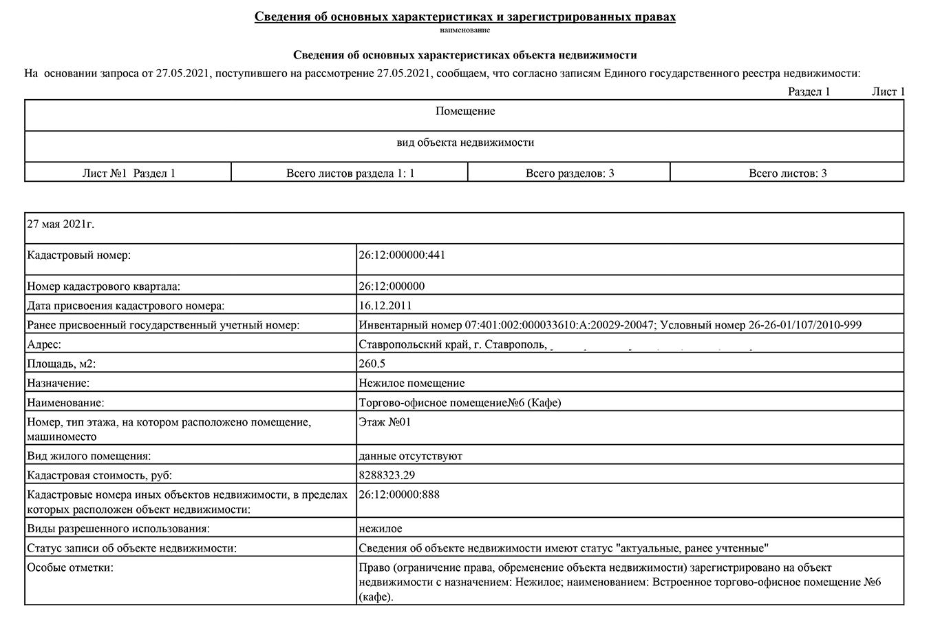 - характеристика объекта — адрес, площадь, этажность, дата регистрации, кадастровый номер и стоимость, назначение;