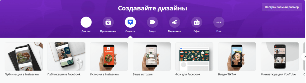 Затем перейдите на главную страницу и в списке шаблонов выберите нужный тип дизайна. Например, в меню «Соцсети» откроется выбор типа поста – есть фоны и шаблоны публикаций для Фейсбук, миниатюры и шапки для Ютуба, посты и обложки ВК. Для Инстаграм здесь можно сделать шаблон как поста, так и сторис, и даже обложек хайлайтов.