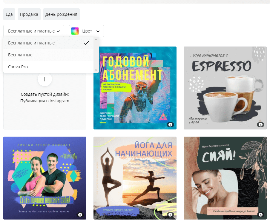 Есть сортировка по бесплатным и платным шаблонам, а также поиск дизайна по цвету