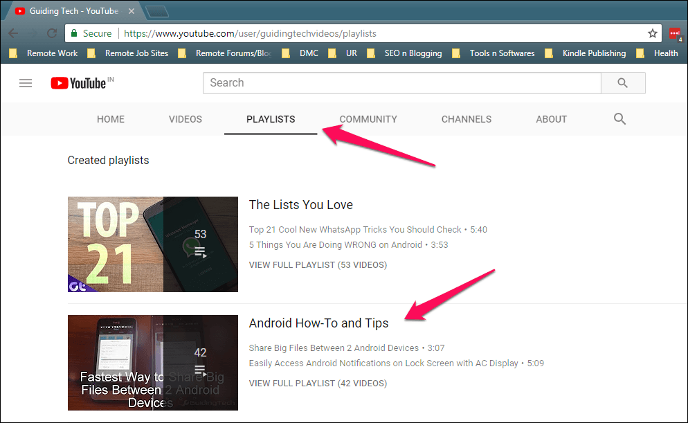 Нажмите на вкладку плейлиста, чтобы открыть все плейлисты, которые предлагает канал. Для целей этого руководства я выберу инструкции и советы по Android. Щелкните правой кнопкой мыши имя плейлиста, чтобы скопировать ссылку.