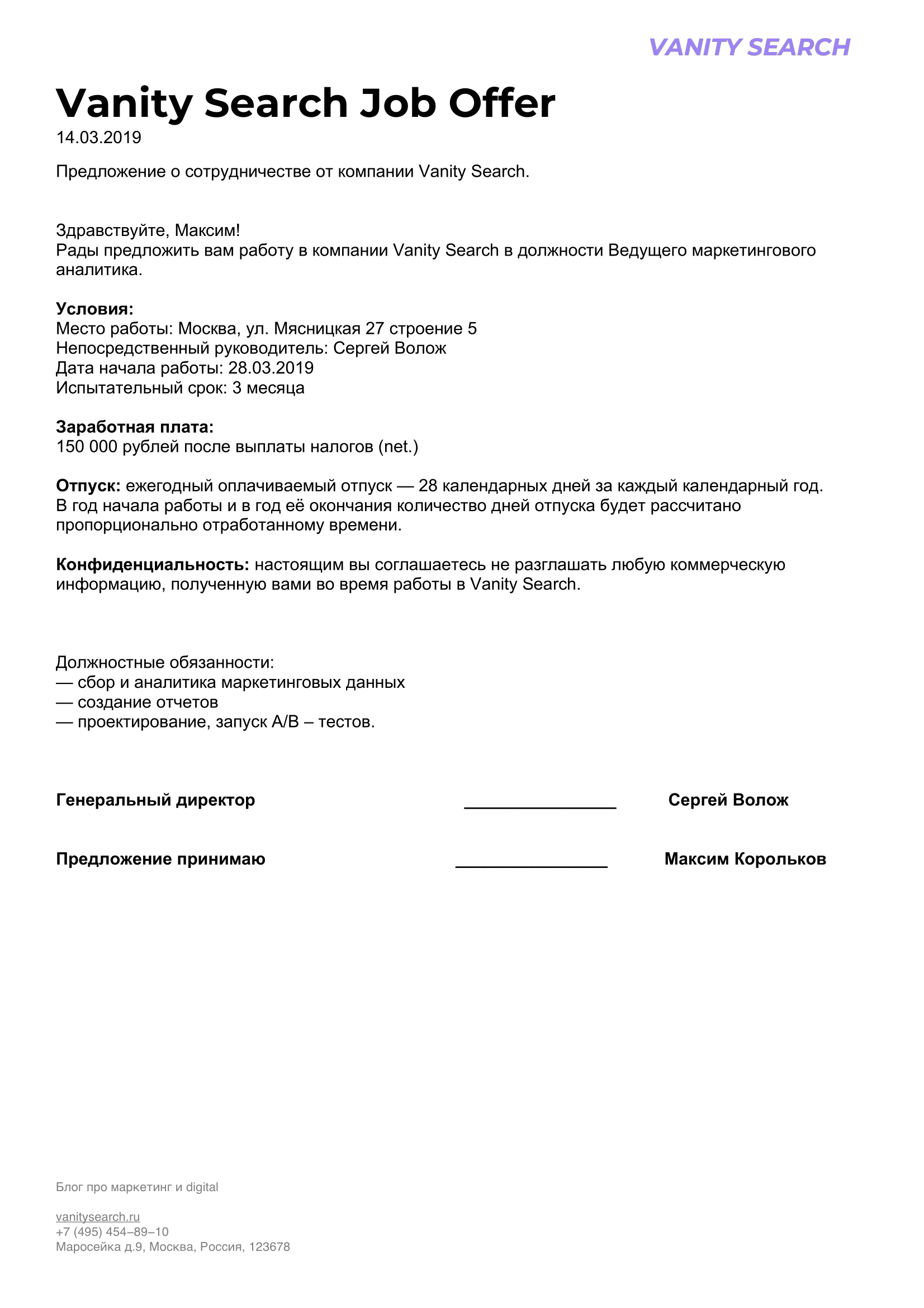 К сожалению, как я писал ранее — российская система рекрутинга весьма сумбурна и в какой-то степени даже беспорядочна. Если все прошло хорошо, вы преодолели все этапы, потратили 7-10 дней жизни и вас решили взять — то вам, по идее, высылают job offer (предложение о работе), в котором есть в первую очередь заработная плата, описываются все условия работы — бонусы, ДМС, корпоративные тренинги, оплаты мероприятий и т.п. Но (!) нужно понимать, что в России — job offer редкая практика, и красивого PDF файла, скорее всего, не будет. Вам озвучат предложение либо по почте, либо по телефону. Ну а на всякий случай, оно выглядит так: