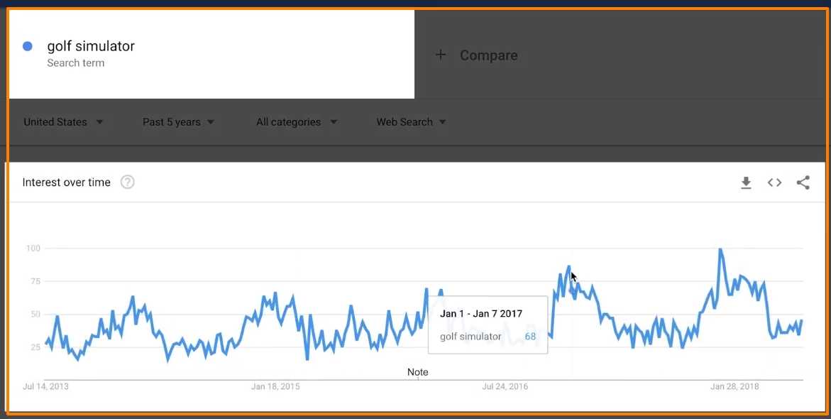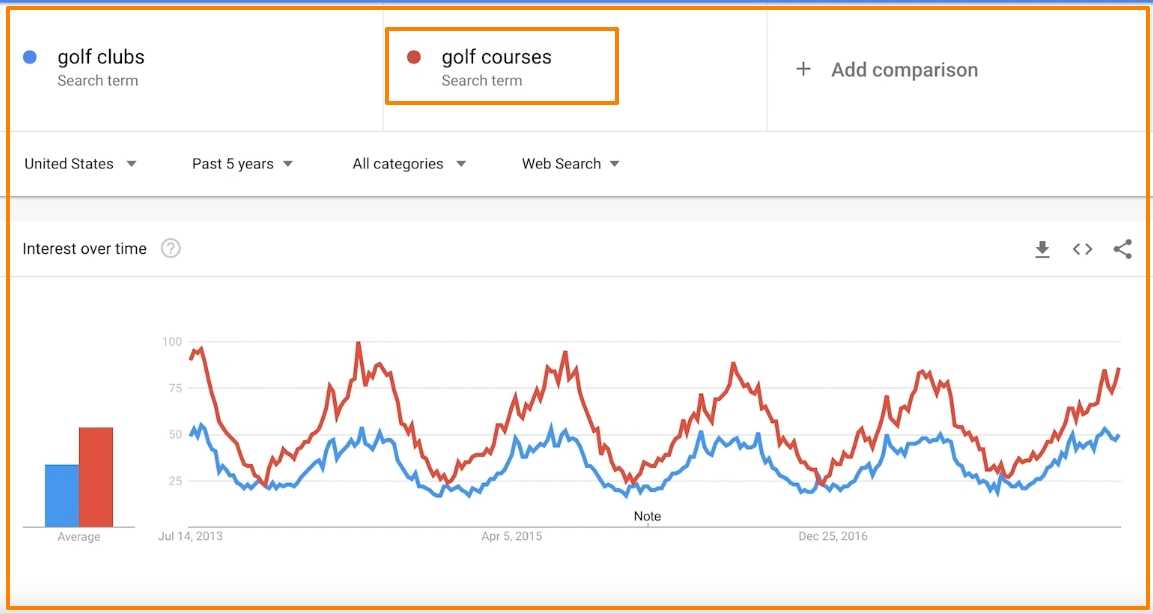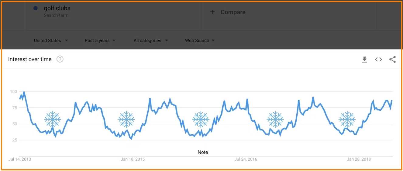Давайте поищем “гольф-клубы” в Trends. Я установлю фильтр дат на последние 5 лет, чтобы посмотреть, существует ли сезонная закономерность.