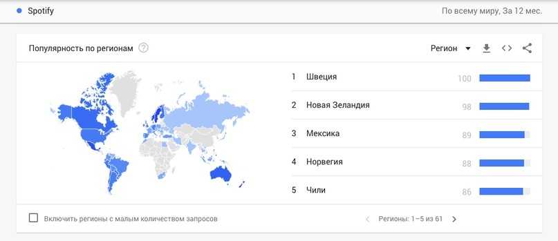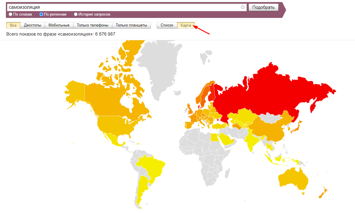 Для просмотра этой информации не нужно делать дополнительных настроек. Просто пролистайте страницу вниз до соответствующих виджетов. В этом виджете сервис также выделяет абсолютные значения (до 100 единиц). Вы можете выбрать весь мир для отображения по странам или одну страну для отображения по регионам.