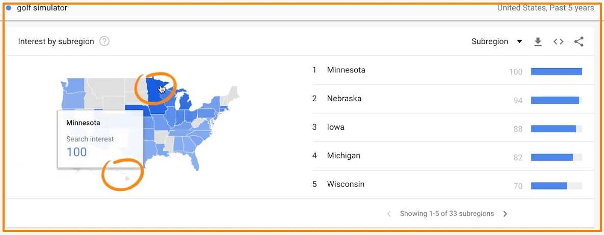 Используйте раздел интересов по регионам, чтобы выделить области для продвижения с помощью платной рекламы. Если вы посмотрите на пятилетний тренд по запросу “симуляторы гольфа”, вы увидите, что он становится более популярным в зимние месяцы.