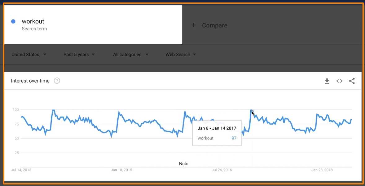 Например, если посмотреть на 5-летнюю тенденцию запросов по слову “тренировка”, вы увидите небольшие всплески каждый январь.