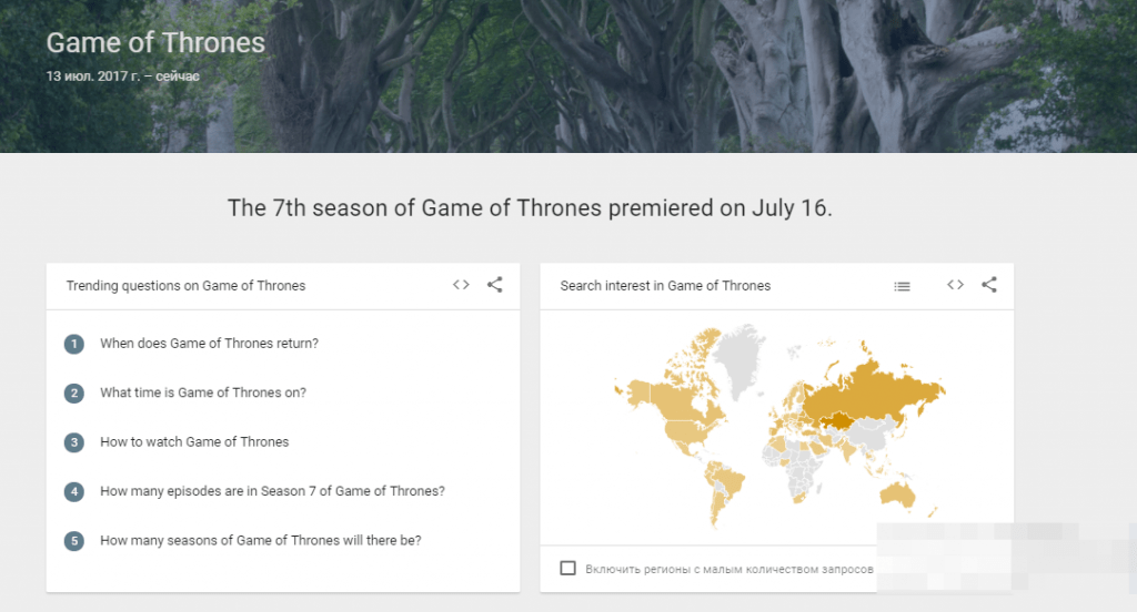 Как видим, данные по этому событию начинаются с 13 июля и по сегодняшний день, а 7 сезон Игры престолов стартовал 16 июля.