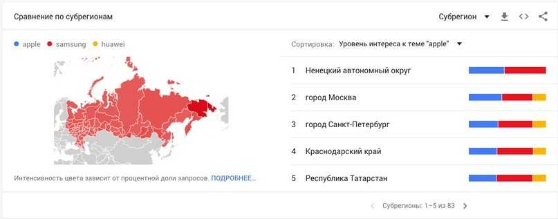 Если вы прокрутите вниз до области “Интерес по субрегионам”, вы увидите тепловую карту популярности.