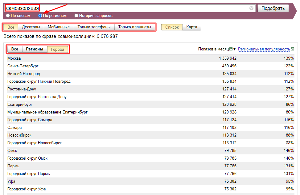 Для оценки популярности запросов нам понадобятся вкладки «По регионам» и «История запросов». На вкладке «По регионам» доступны данные по популярности запроса в разрезе регионов/городов.