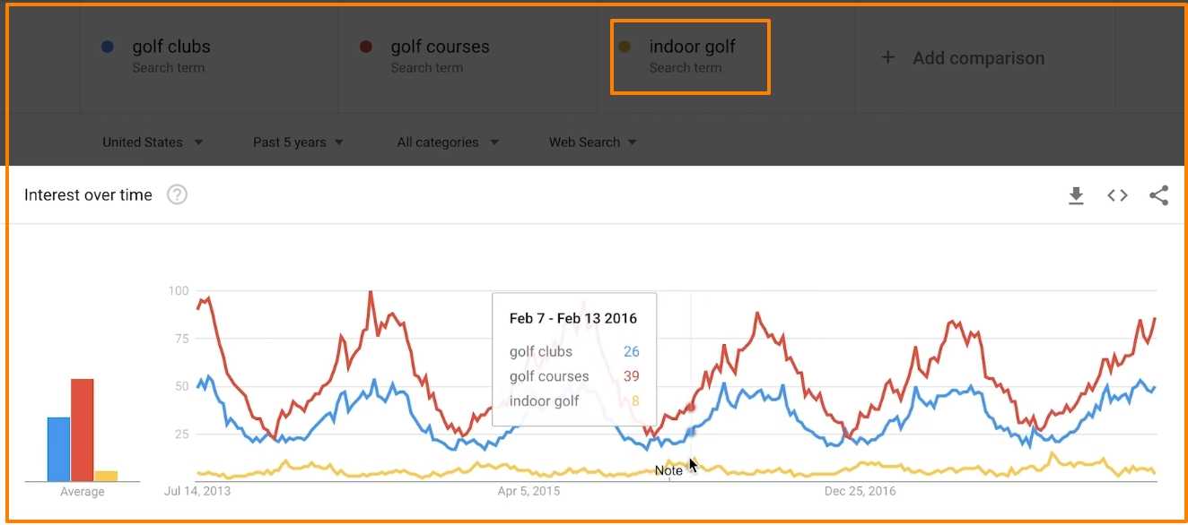 Наконец, я добавлю последний слой — “гольф в помещении”. Вы увидите противоположный эффект. Тренд по последнему термину немного повышается в зимние месяцы.