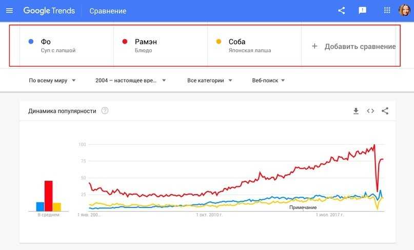 Обрабатывая запрос как тему, Google Trends будет подтягивать данные по совершенно другим ключам, но за которыми стоит исходное понятие. Например, осуществляя поиск по теме «Москва», в статистику будут подтягиваться запросы по типу «столица России». Больше на этот счет можно почитать в справке Google.