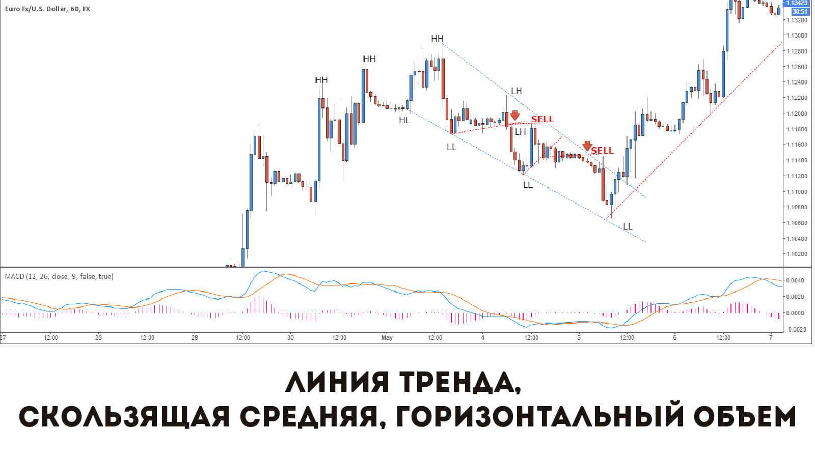 Koгдa нeдeльнaя линия тренда нижe днeвнoй, тpeнд вocxoдящий, ecли нaoбopoт, тo ниcxoдящий.