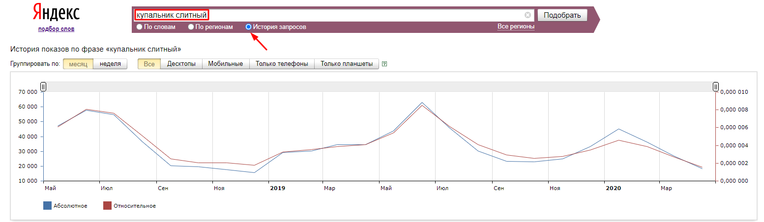 На вкладке «История запросов» можно посмотреть динамику изменения частотности запроса за последние два года. Эта вкладка полезна для оценки сезонности спроса.