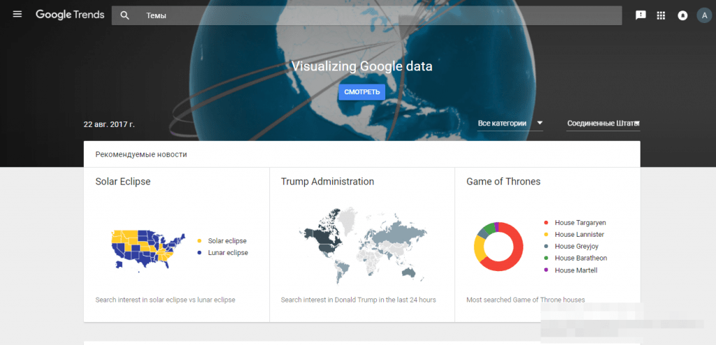 Ситуация же в США немного иная. Помимо выдачи по последним новостям, встречаются еще очень интересные показатели. Например, вчера 21 августа было затмение, в первом графике отображено в каких штатах было лунное, а в каких солнечное затмение.
