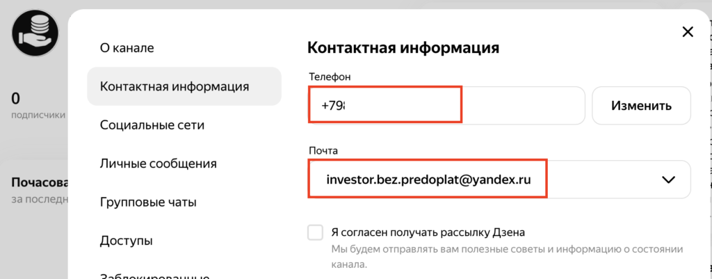 Проверяем контактную информацию (телефон и электронную почту). Эти данные могут понадобиться для восстановления доступа к каналу. От пользователей данная информация скрыта.
