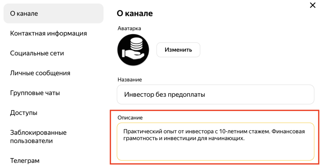 Добавляем описание канала. Описание должно отражать концепцию канала и преимущества.