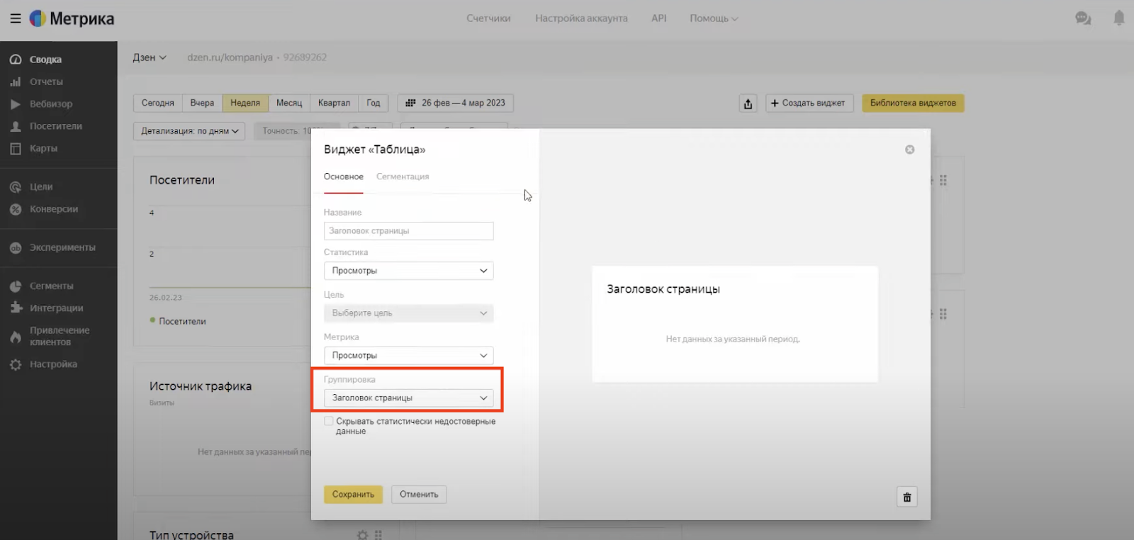 Переходим в раздел «Сводка» — «Адрес страницы» — «Группировка» — «Заголовок страницы» — «Сохранить».