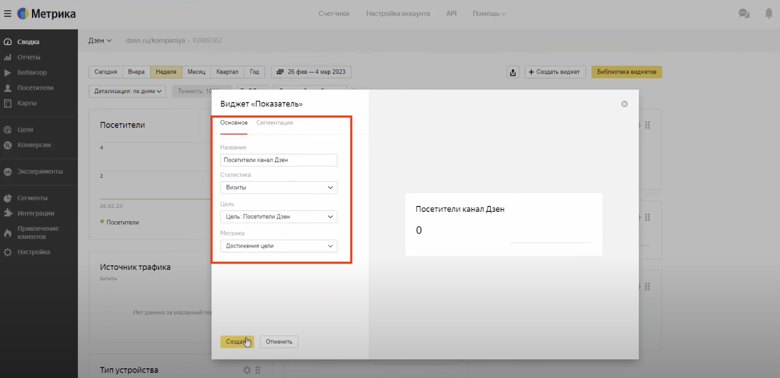 Нажимаем «Создать виджет». Устанавливаем название — «Посетители канала Дзен». Статистика — визиты. Цель выбираем из целей, добавленных ранее (Посетители Дзен). Метрика — Достижение цели. Нажимаем «Создать».