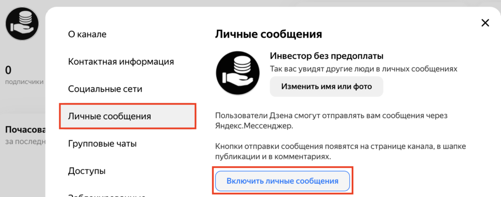 Вы можете общаться с пользователями через Яндекс Мессенджер посредством личных сообщений. Для этого в настройках нужно включить личные сообщения и при желании изменить аватар или имя, которые будут использоваться при отправке сообщений от имени канала.