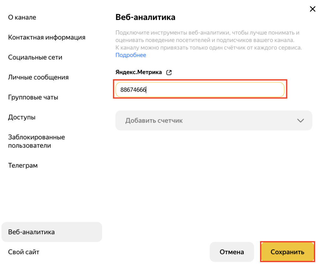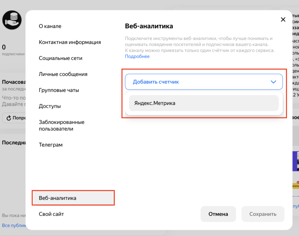 Для подключения счетчика Яндекс Метрики кликните «Настроить канал». Если у вас уже есть счетчик, то в самом низу раздела «Дополнительно» кликните «Подключить Метрику» и вставьте номер счетчика в появившееся поле. Если счетчика нет, то зайдите в Яндекс Метрику и создайте его. В поле «Адрес сайта» укажите адрес профиля. Затем скопируйте номер, вернитесь в настройки и привяжите счетчик.