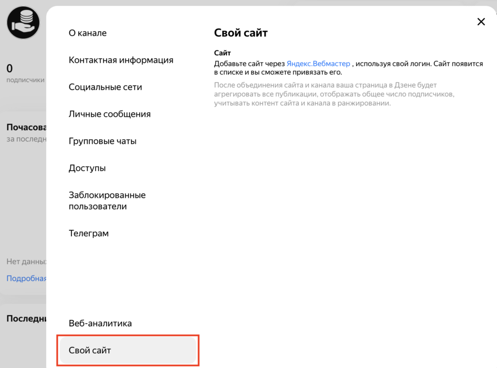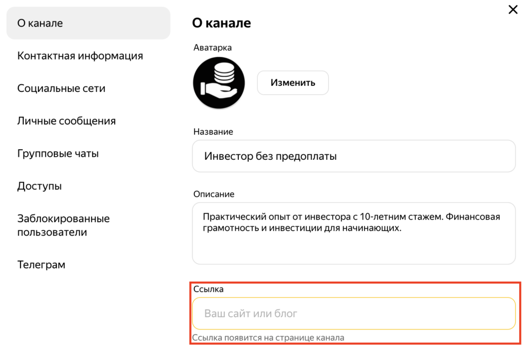 Если у вас есть сайт или блог, то здесь вы можете добавить на них ссылку. Ссылка появится на странице вашего канала в Дзен.