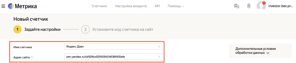 Указываем имя счетчика и адрес сайта (ссылка канала в Дзен).