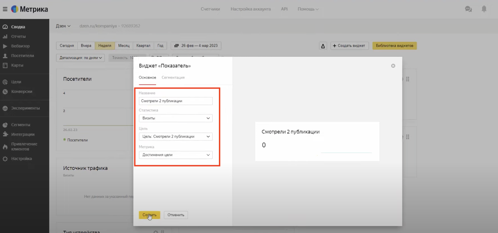 Теперь добавим виджет «Показатель». Для этого нажимаем «Создать виджет». Устанавливаем название — «Смотрели 2 публикации». Статистика — визиты. Цель выбираем из целей, добавленных ранее (Смотрели 2 публикации). Метрика — Достижение цели. Нажимаем «Создать».