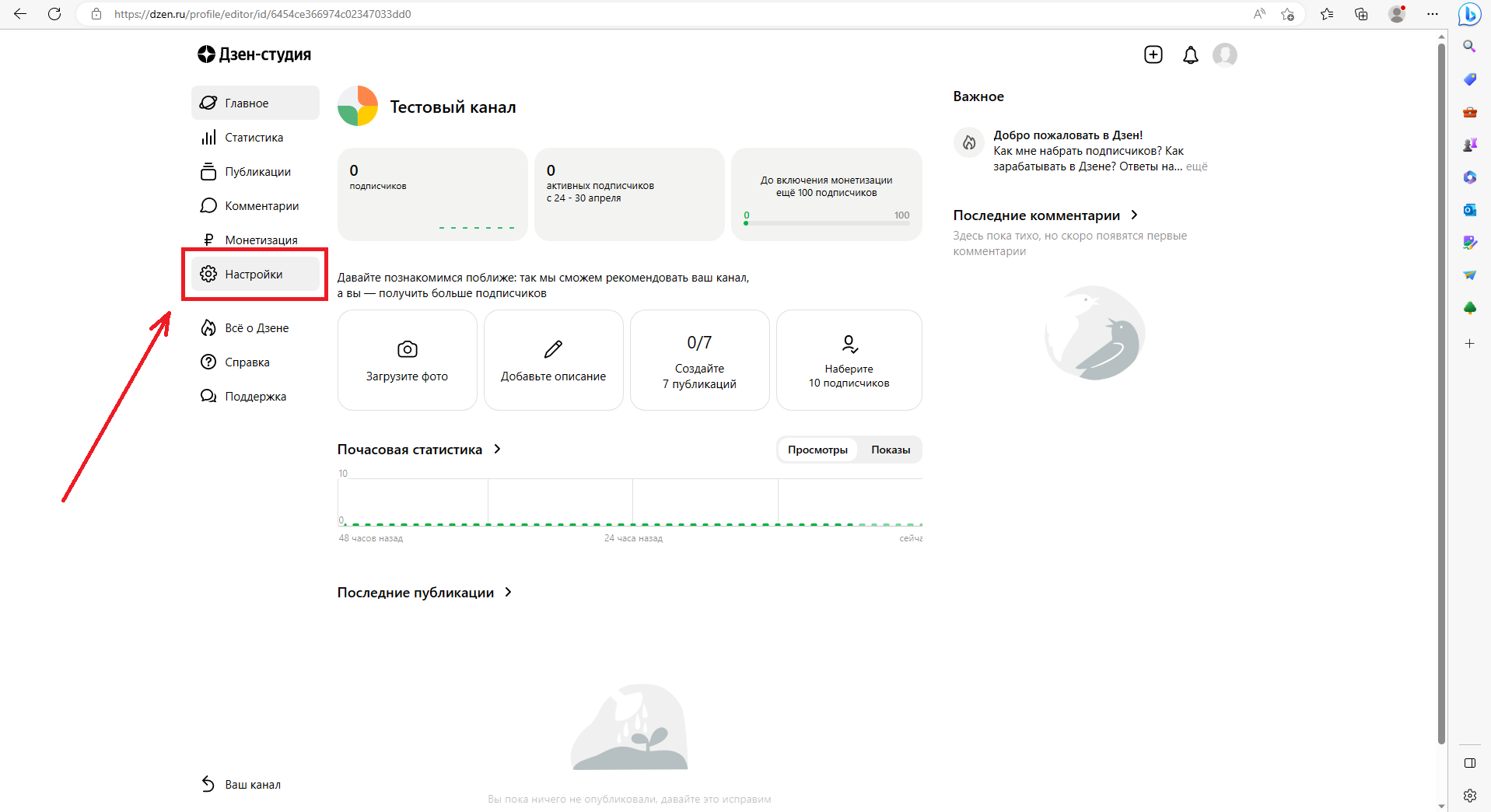 - Нажать «Настройки» в Дзен-студии: