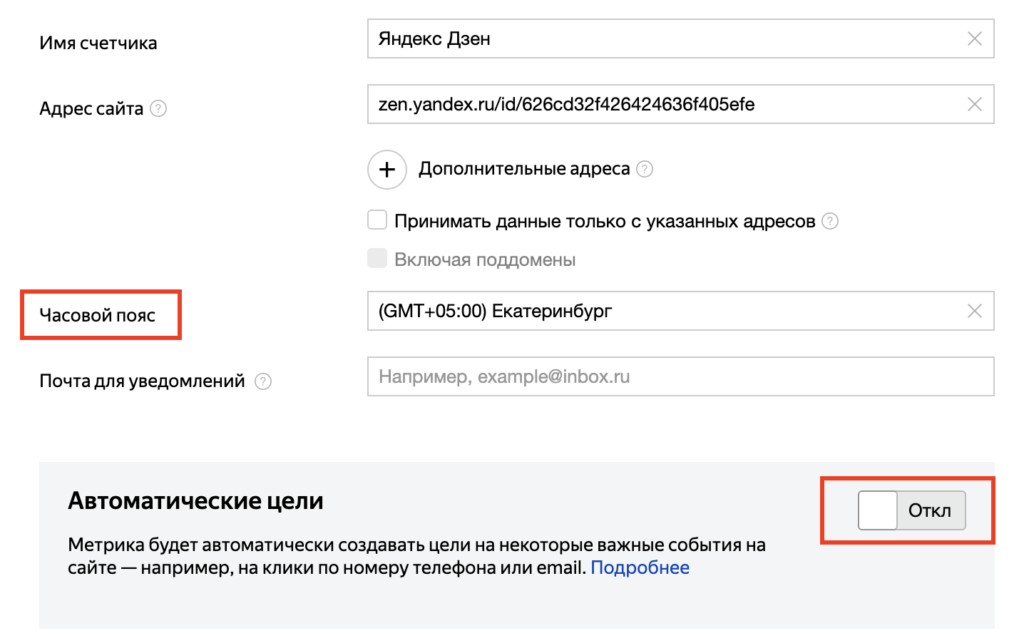 Проверяем часовой пояс и отключаем автоматические цели.
