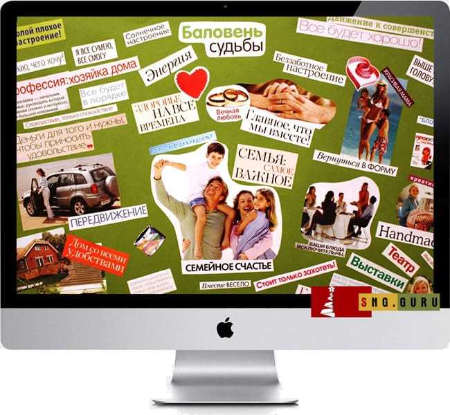 Как правило, это доска, на которой размещаются символические изображения, ассоциирующиеся с вашим желанием. Использовать можно только изображения или только текст, но лучше, если оба варианта будут использованы.
