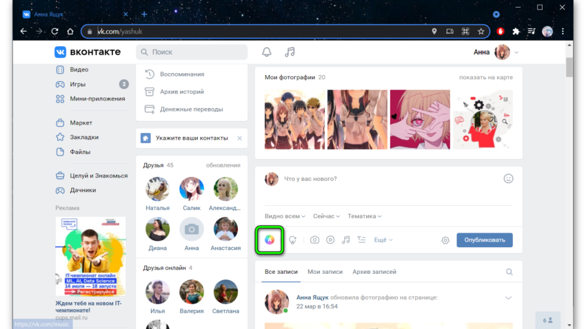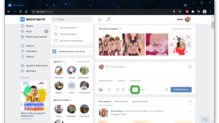 Чтобы создать постер, достаточно воспользоваться специальной кнопкой, находящейся над стеной на панели с перечнем доступных действий. Она выглядит как большая буква А на фоне яркого разноцветного шара. Тем, кто не заметил описанную иконку сразу, следует ориентироваться на надпись «что у Вас нового». Нужный значок расположен чуть правее.