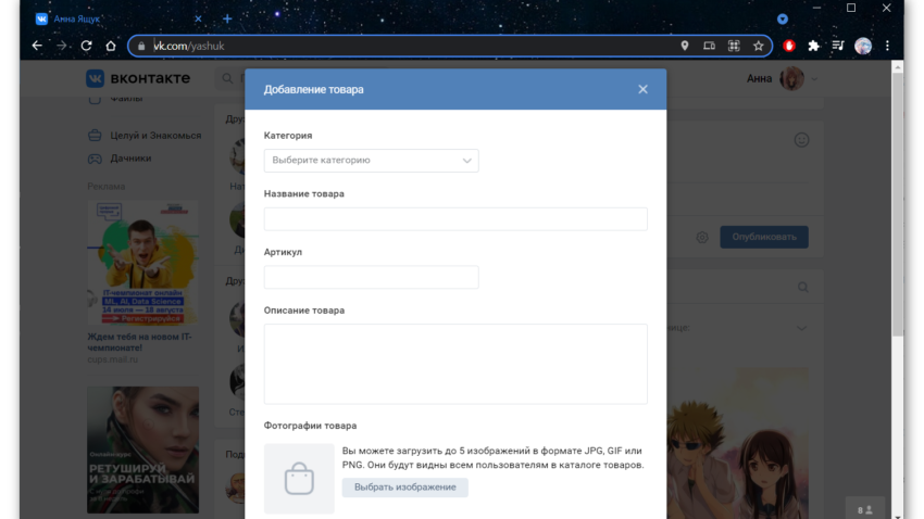 Здесь вы можете выбрать категорию, указать название и артикул, сделать описание и добавить изображение, фото товара или баннер. Указать цену и местоположение.