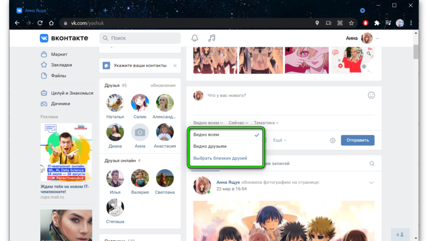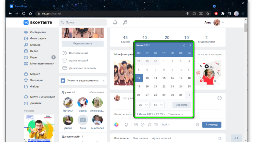Выставьте режим видимости: «Видно всем» или «Только друзьям». Выберите время публикации. Если этот параметр не настроить пост будет опубликован сразу, как вы нажмете кнопку «Опубликовать».