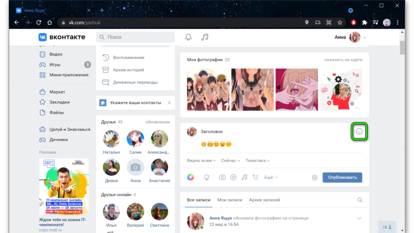 В посте с текстом вы можете использовать любые смайлы. Кнопка для активации эмоджи находится в правом верхнем углу редактора. Чтобы добавить смайлы в конец предложения, например, вы написали большой пост и решили разбавить его эмоциями просто устанавливаете курсор в нужное место в тексте активируете смайлы и выбираете нужные эмоджи.