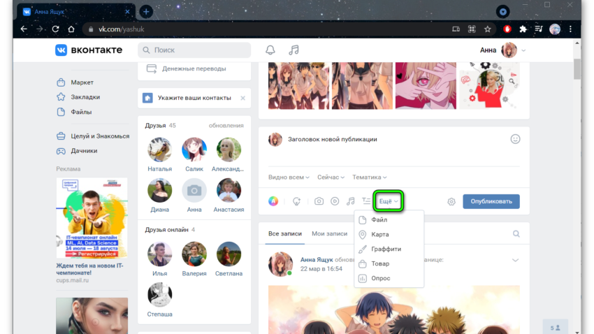 По клику на кнопку «Ещё» открывается набор инструментов, которые тоже можно использовать при создании поста в ВК.