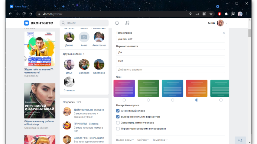 Задаете тему опроса и указываете варианты ответа. Можно добавить произвольное количество ответов. Выбираете фон и устанавливаете настройки. Например, чтобы опрос был анонимным или можно выбрать несколько вариантов. Устанавливаете ограничение по времени для опроса.