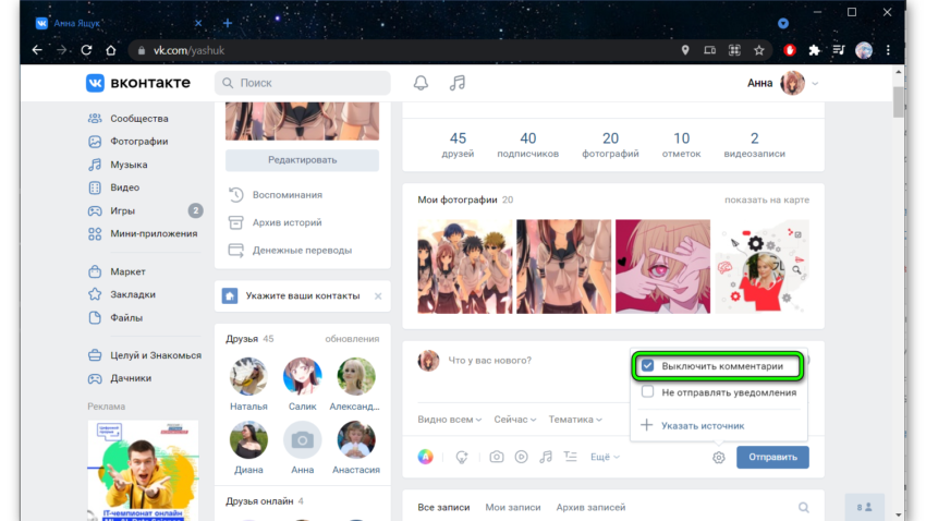 Нажмите на кнопку в виде шестерни возле кнопки «Отправить», чтобы включить или отключить комментарии. Возможность комментировать публикацию повысит лояльность ваших подписчиков, они могут прямо под постом задать уточняющий вопрос и получить обратную связь. Но если публикация исключительно информационная, например, о предстоящих событиях в городе, или об акции, комментарии можно отключить.