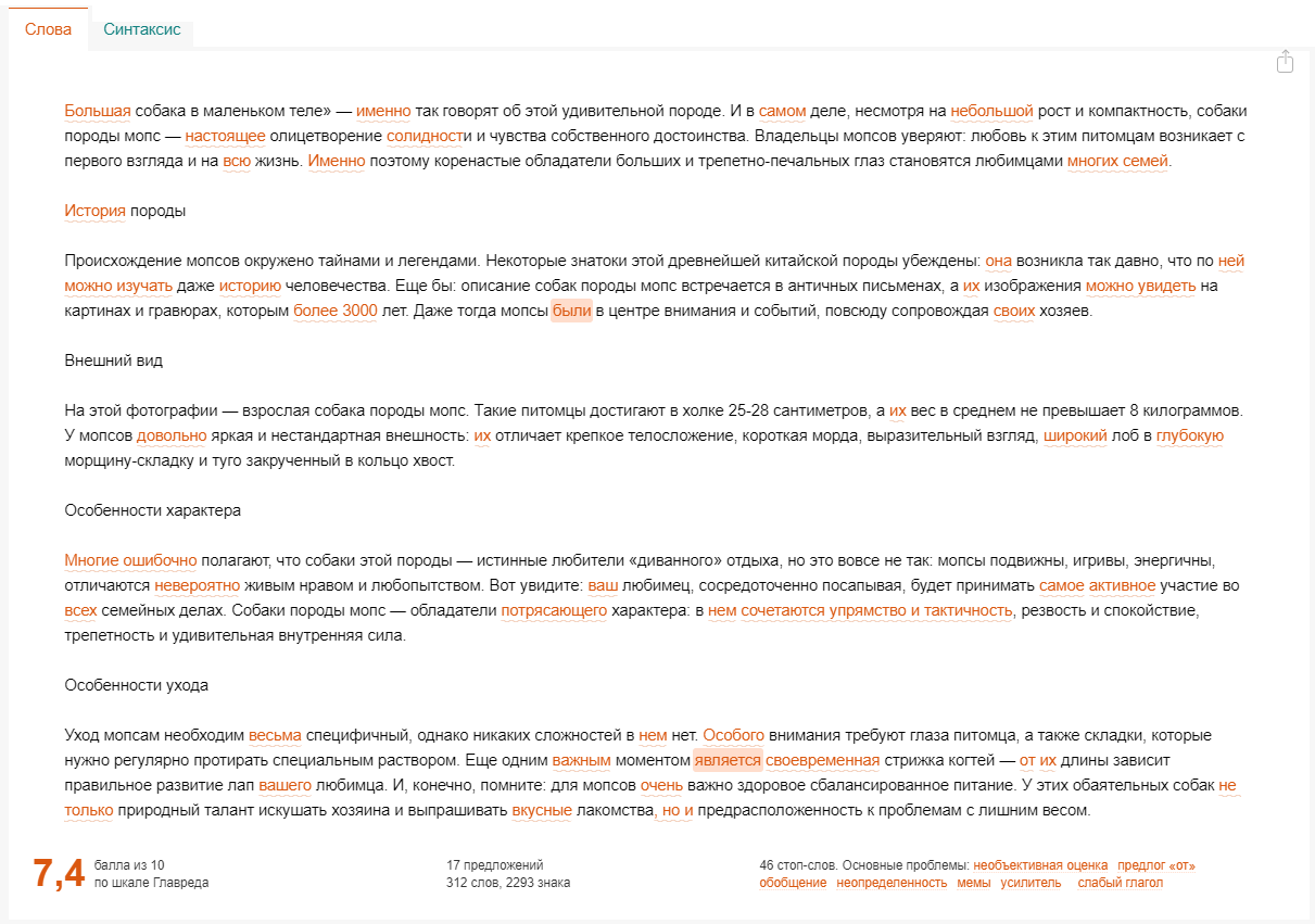 Есть два варианта сервиса – «добрый» и «злой». Злой Главред жёстко оценивает и критикует текст, Добрый же даёт советы и рекомендации, и проверяет сразу по двум показателям: чистота и читаемость.