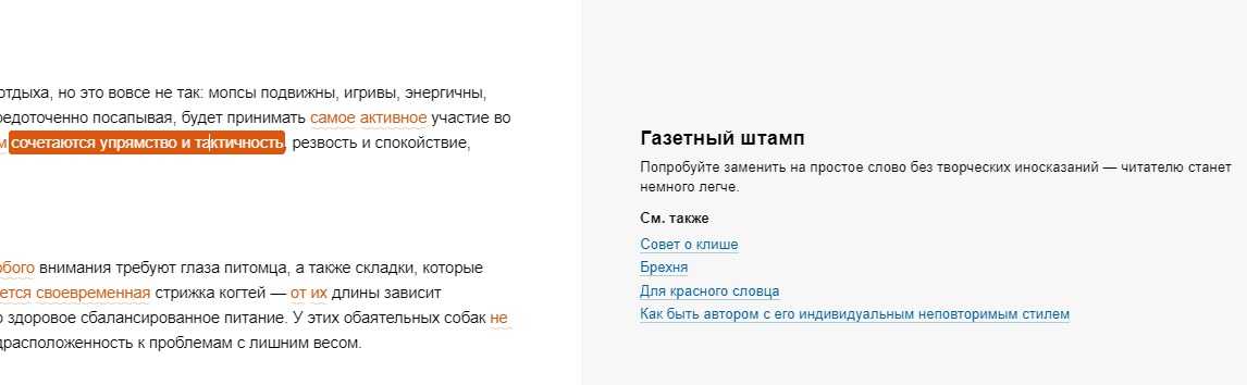 Главред выискивает в тексте стоп-слова. Словесный мусор, без которого можно обойтись. Сервис дико ненавидит неопределенности. Если напишете “много”, “мало”, “через несколько лет”, он потребует конкретики. Главред борется и со штампами вроде “на сегодняшний день”, “всем известно”.