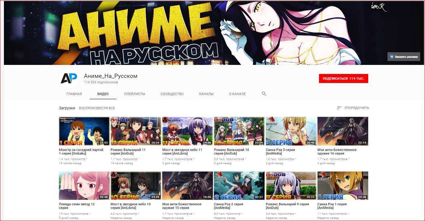 «Аниме на русском» – канал с популярными аниме сериалами, 114 тысяч подписчиков.