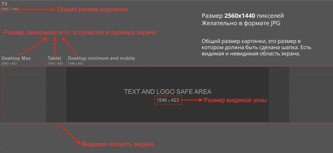 Размер 2560х1440 пикселей. Желательно в формате JPG. Общий размер картинки, это размер в котором должна быть сделана шапка. Есть видимая и невидимая область экрана.