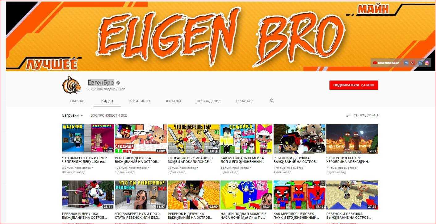 ЕвгенБро – тематичный развлекательный канал по игре Майнкрафт. На баннере ссылки на страницы ВК, инстаграм. Аскетично, но понятно о чём. Евген Бро известен среди геймеров, поэтому авторы не стали морочиться с созданием тематической картинки, поставив на неё имя автора.