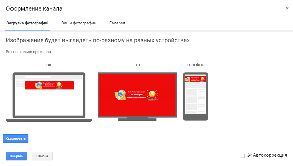 Основная часть подписчиков будет видеть часть шапки с размерами 1280х350. В этой части разместите основную картинку. Что делать с оставшимся частями картинки? Залить фоном, которой на основной картинке. Вот так сделал я (можно было по заморачиваться, вместо однотонного красного фона по бокам придумать что-то оригинальное, но вряд ли сейчас мой канал настолько популярен, что его будут смотреть сотни пользователей на телевизоре):Если Вы не сильны в фотошопе, в гугле вбейте “шапка для youtube 2560 х 1440” и выберете подходящую картинку или шаблон картинки. Но все равно, какую бы классную картинку Вы не нашли, она не будет отображать Ваши идеи