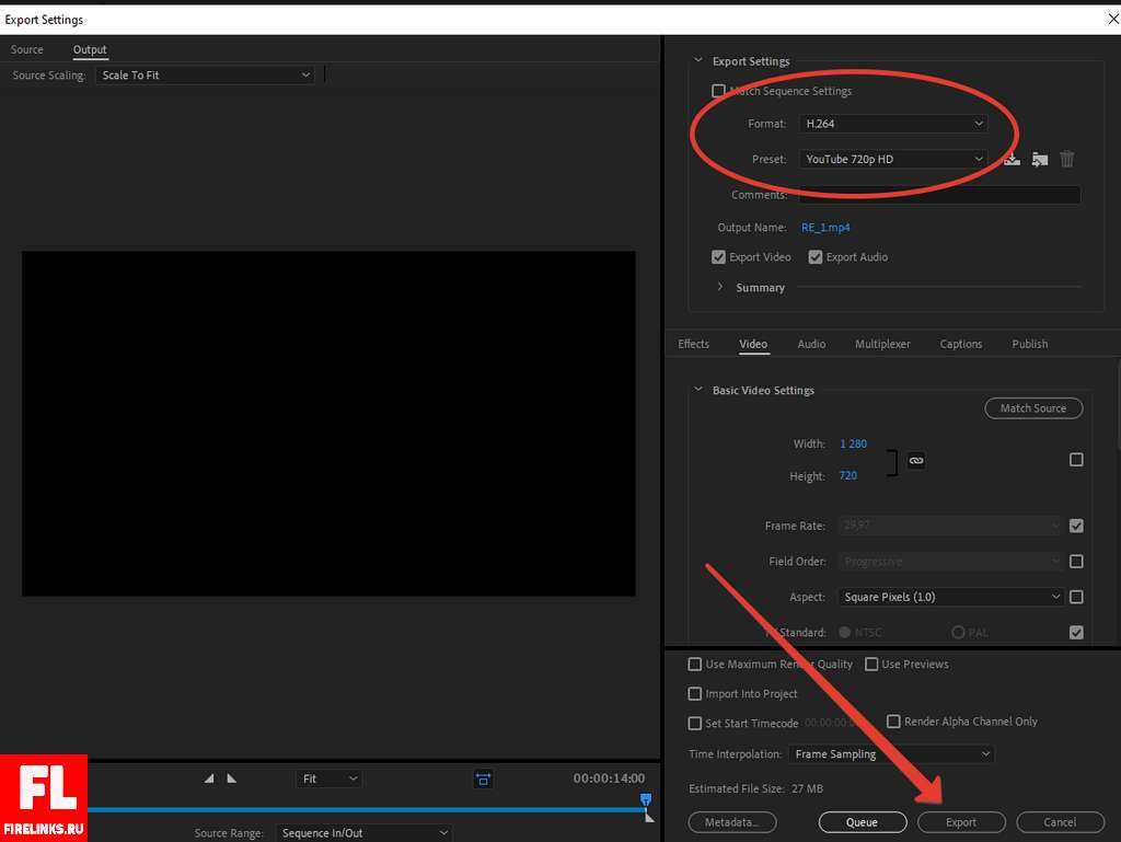 - Формат кодека вывода ролика H.264 (самый популярный кодек для видео всех редакторов типа ПремьерПро, Сони Вегас и т.д.);