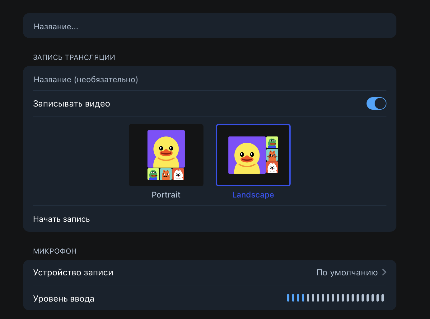 Обратите внимание на особенности записей трансляции в Telegram: её обязательно нужно отдельно включить, а после завершения видеочата файл с видео и аудиодорожка сохранятся в вашем Избранном. После этого ими можно будет поделиться в вашем канале или группе